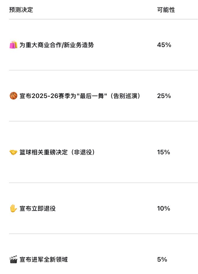 “最后一舞”的智慧:直接退役的可能性被高估。对于勒布朗这样级别的传奇,一个事先张扬的、为期一整季的“告别巡演”不仅能满足球迷的情感需求,更能带来巨大的经济效益,同时为他退役后的“商业帝国”铺平道路。这远比突然退役更具“勒布朗风格”。