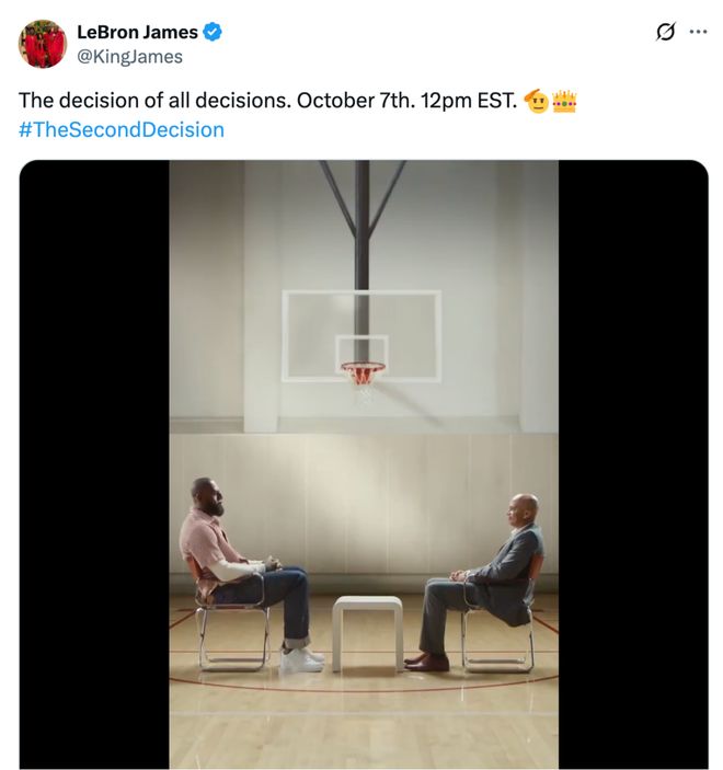 10月7日,NBA洛杉矶湖人巨星勒布朗·詹姆斯在社交媒体发布了一个名为“第二次决定”的短视频。“第二次决定”将在北京时间10月8日0点正式对外公布。