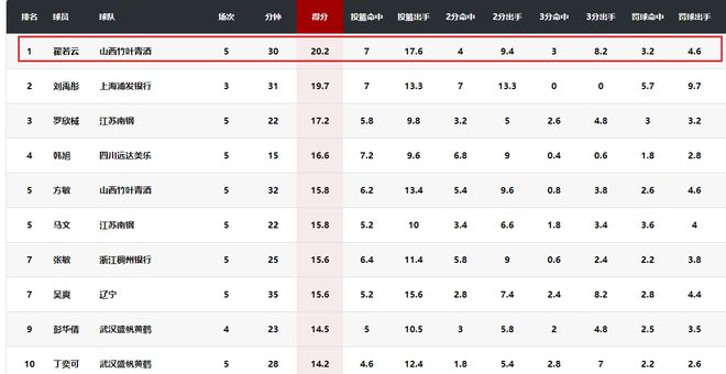 在目前的得分榜上,翟若云场均得到20.2分排名第一,刘禹彤场均得到19.7分排名第二,罗欣棫场均得到17.2分排名第三,韩旭场均得到16.6分第四,方敏和马文都是场均得到15.8分并列第五。